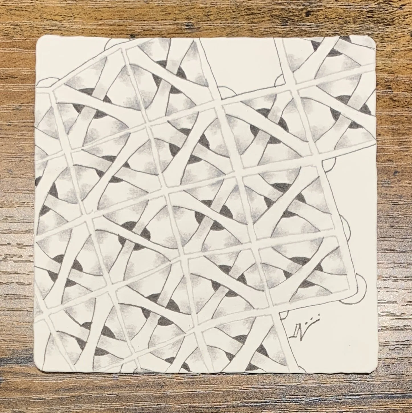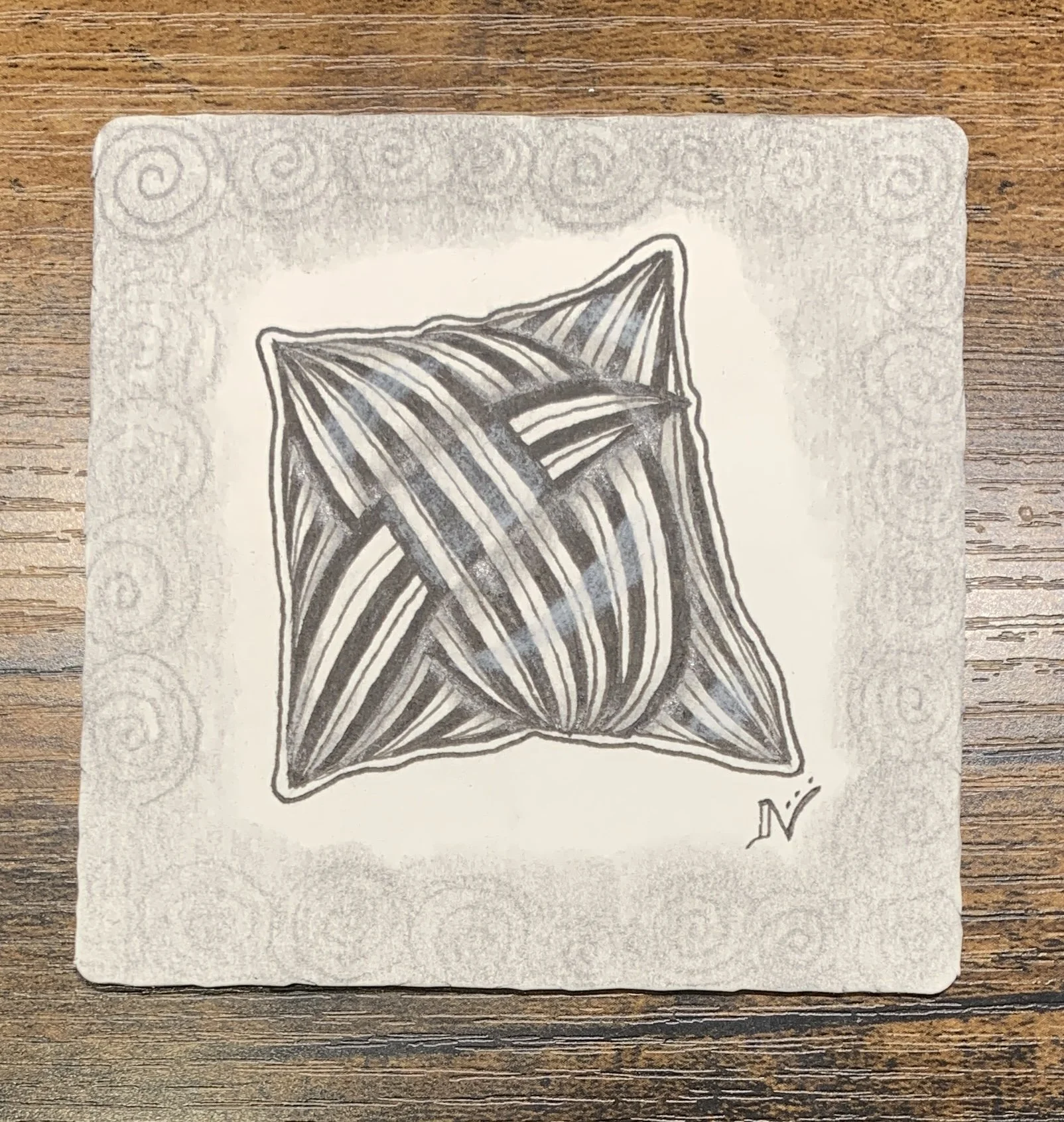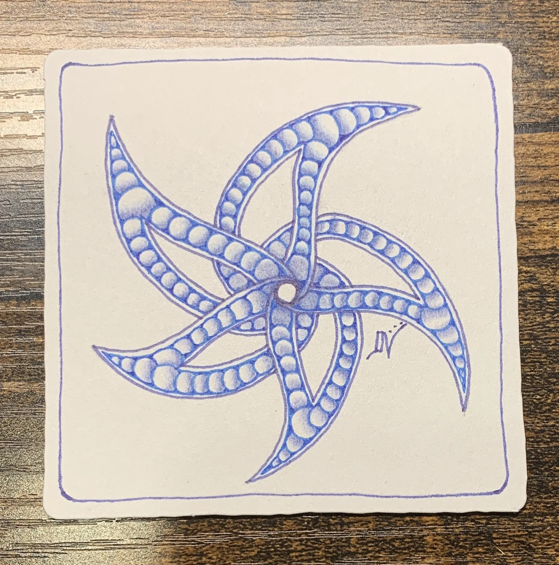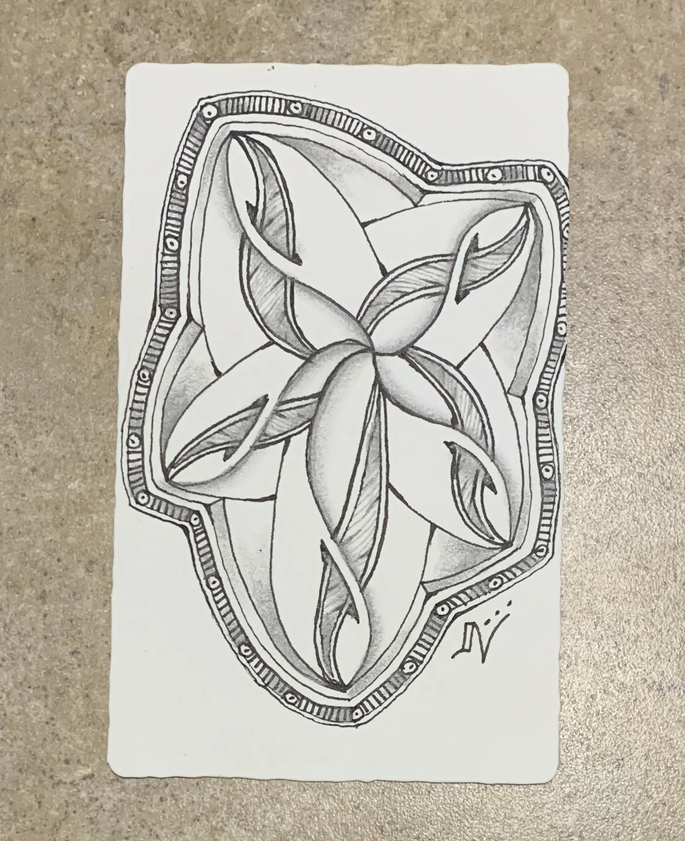 Foundabout is one of my favorites of the new tangles introduced at ZenAgain in 2022. This rendition added extra layers ensuring that we drew behind creating a full-bodied Phi tile.