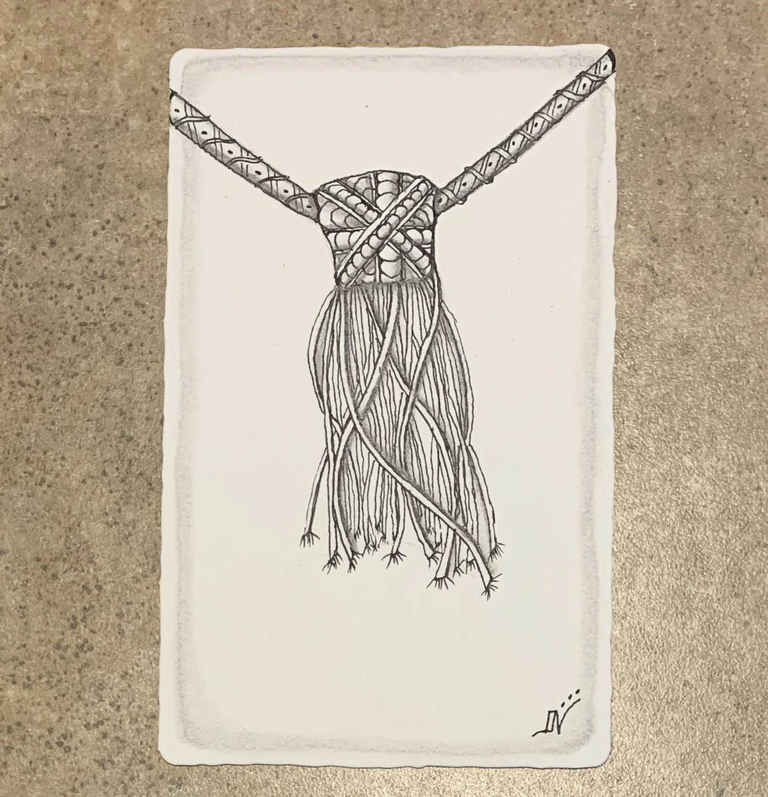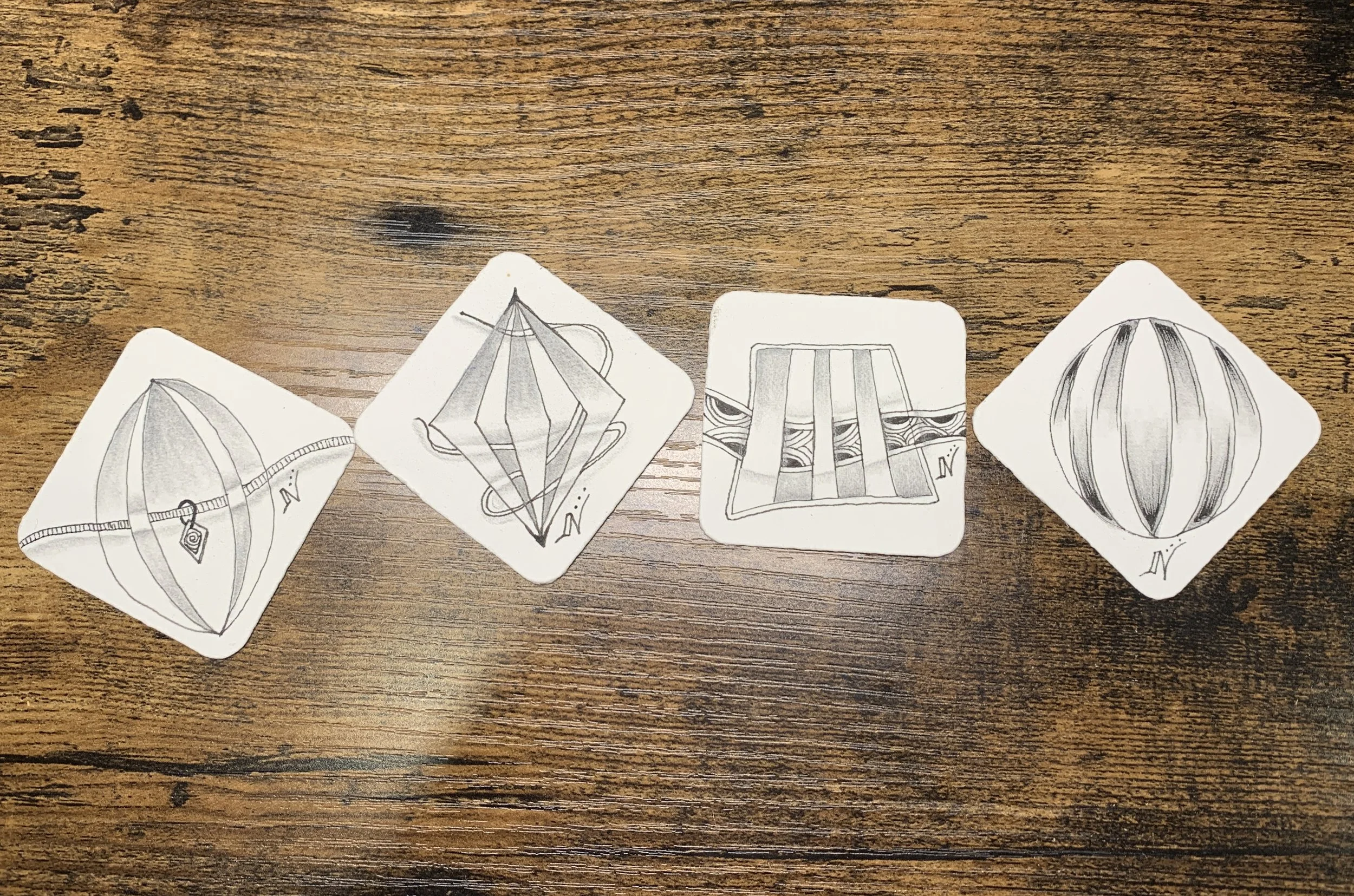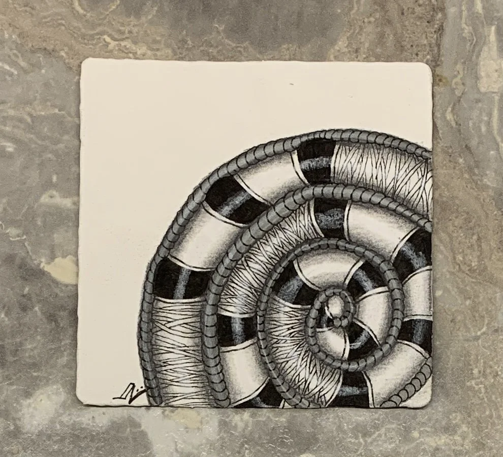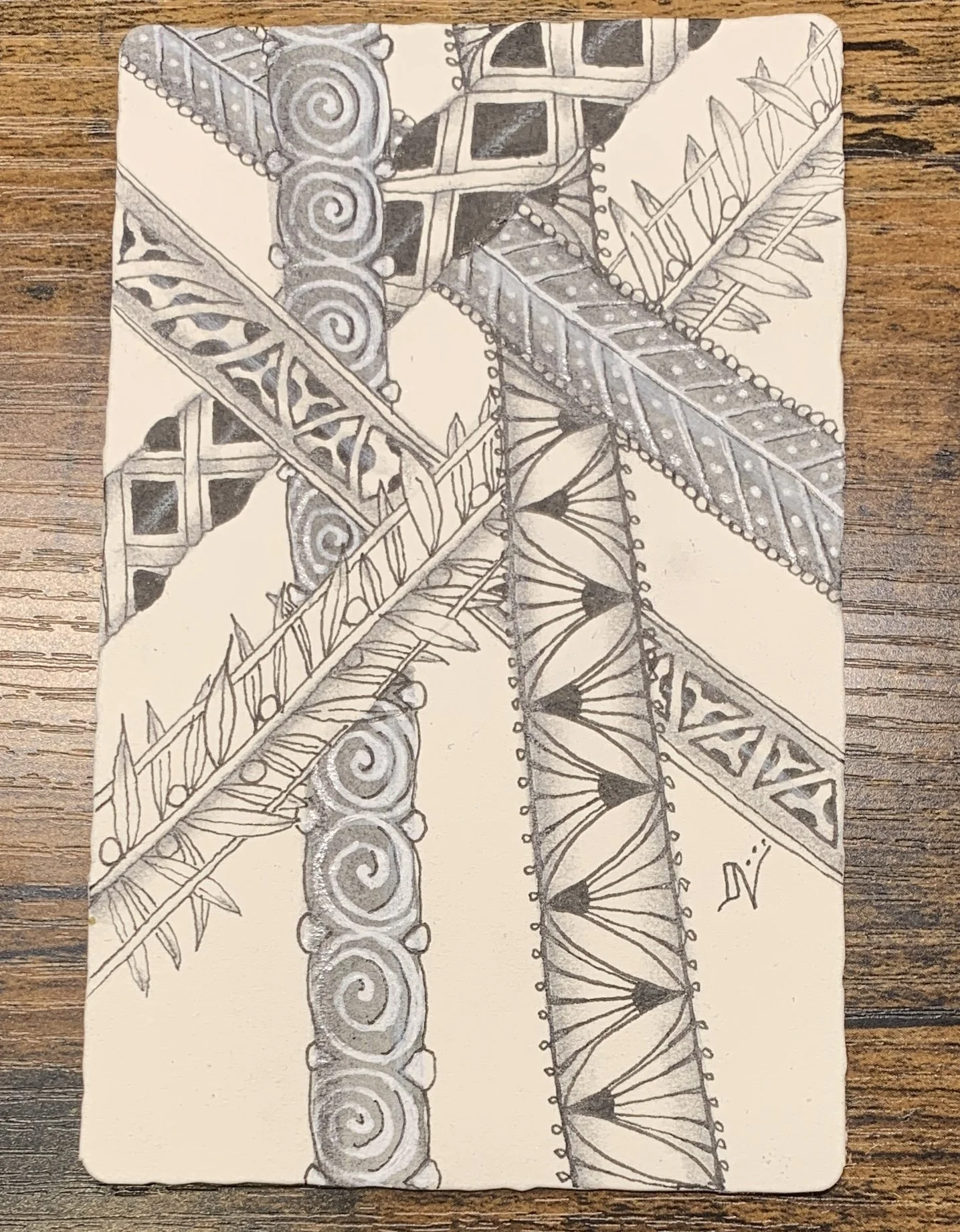 Foundabout is one of my favorites of the new tangles introduced at ZenAgain in 2022. This rendition added extra layers ensuring that we drew behind creating a full-bodied Phi tile.
