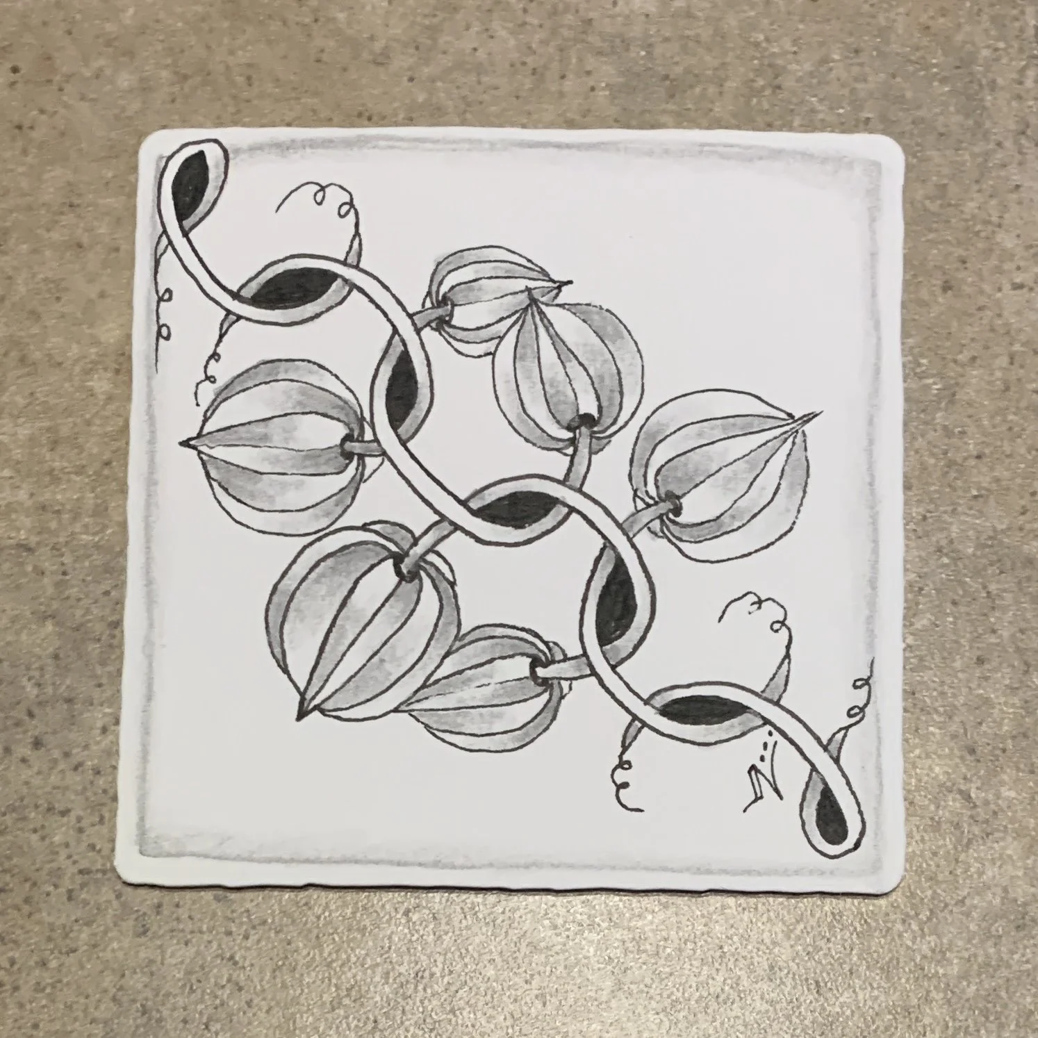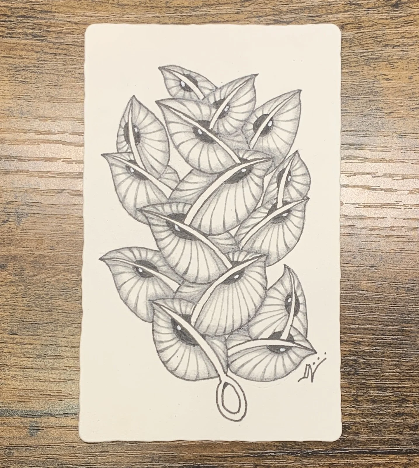 I don’t know that I would have thought to draw Pokeleaf this way, but it is now going to be a regular consideration in my tangle practice. Once again we used the opposite shading technique.
