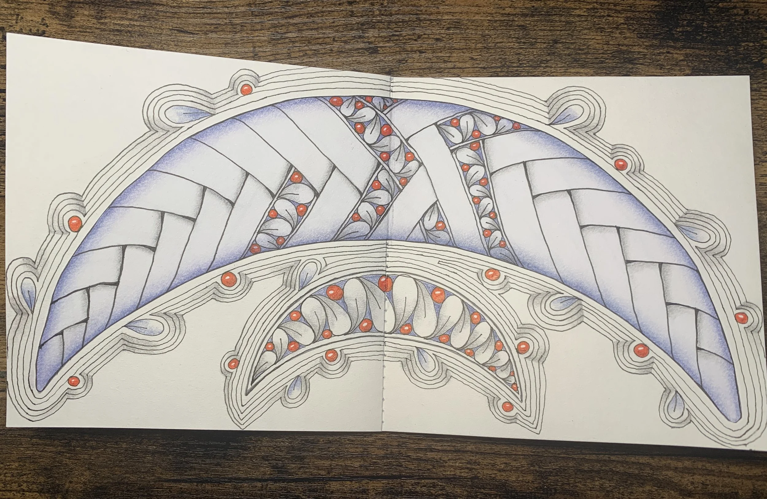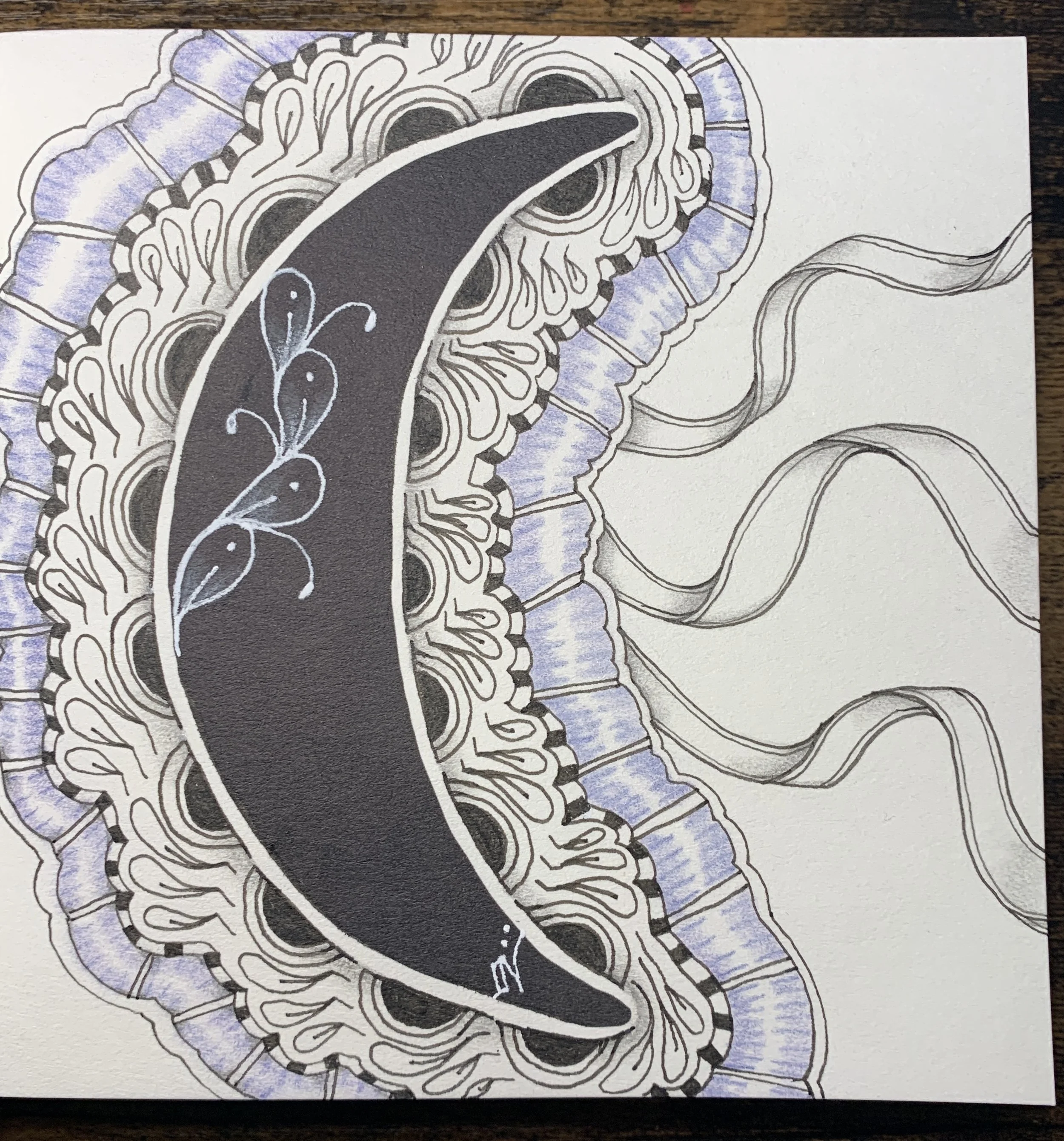 Molly and Martha tangle variations of Cresent Moon so that they shine through the cover moon cutout.