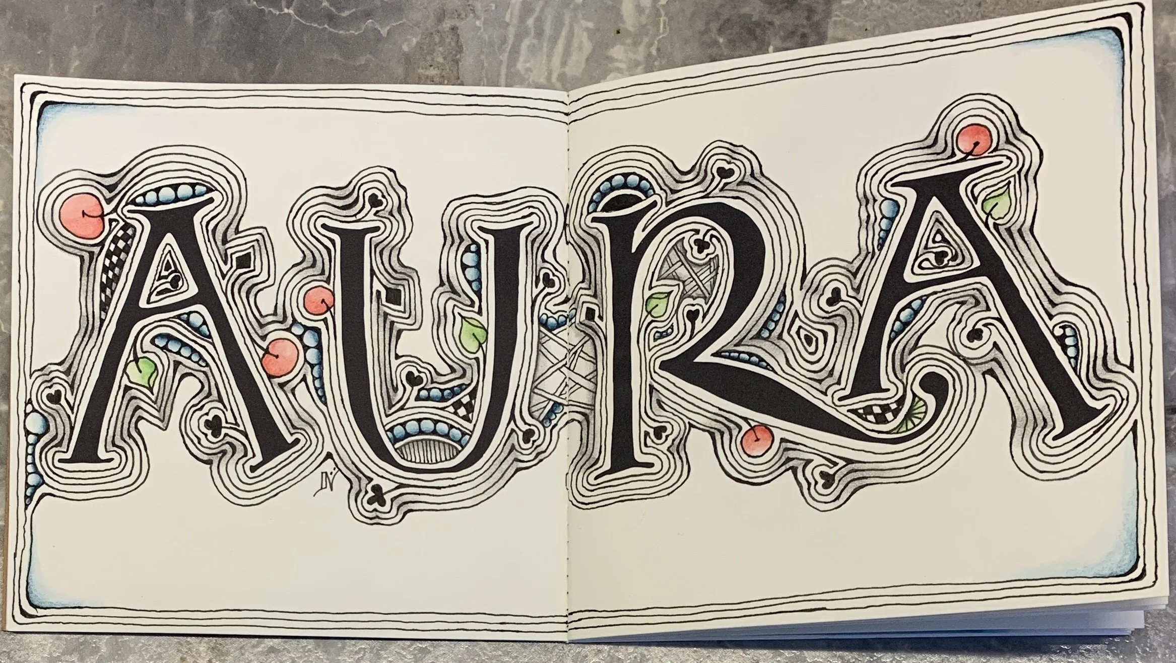 Molly and Martha used the Embedded Letters technique on the AURA page. They added hearts, orbs, knights bridge and other designs into the aura spaces and I added a aura border.