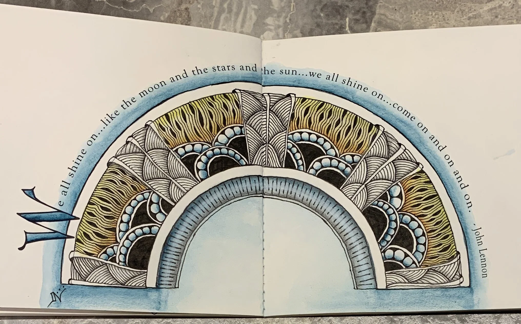 On Julie’s day, she worked on a page with a half moon shape and a beautiful song quote from John Lennon, “We all shine on … like the moon and the stars and the sun … we all shine on … come on and on and on.” Her page includes Shattuck, Diva Dance and Moon Pie. I added a Doodah inside border.