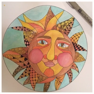 I left some of the sun untangled to provide contrast for the rays. I used these tangles for the face: